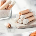 Barquillos crujientes, rellenos de manjar artesanal y bañados en una fina capa de chocolate blanco en su interior y extremos.