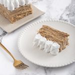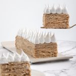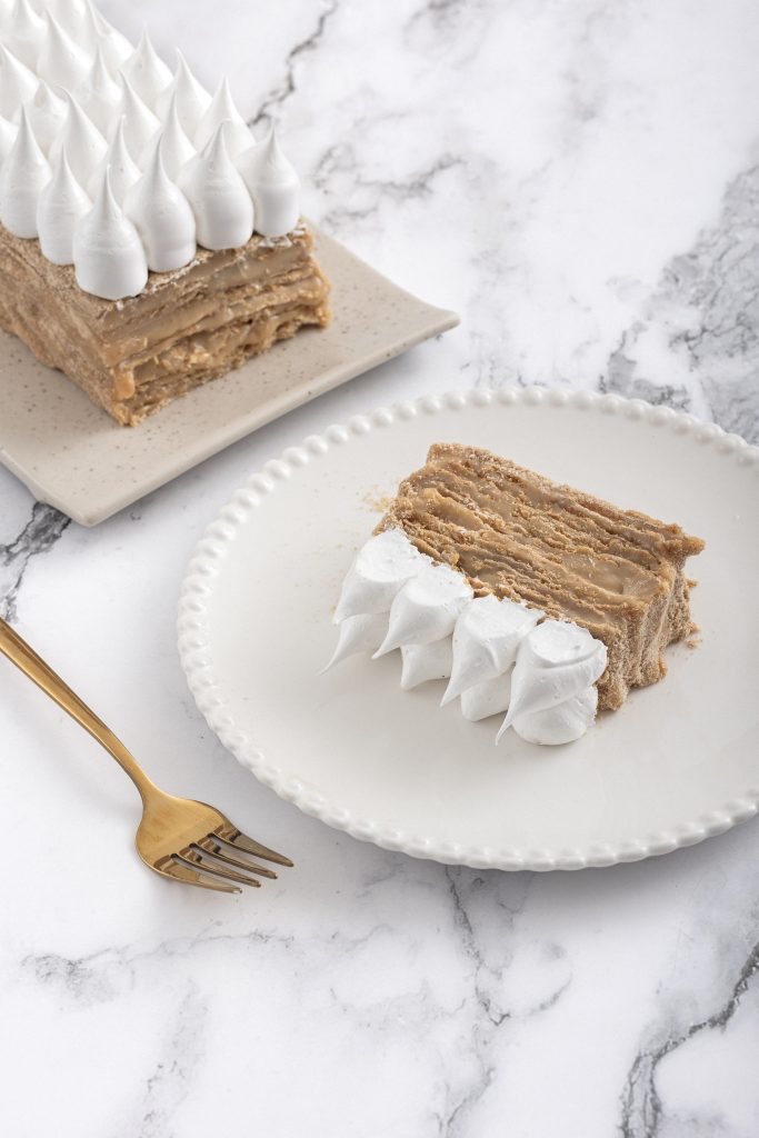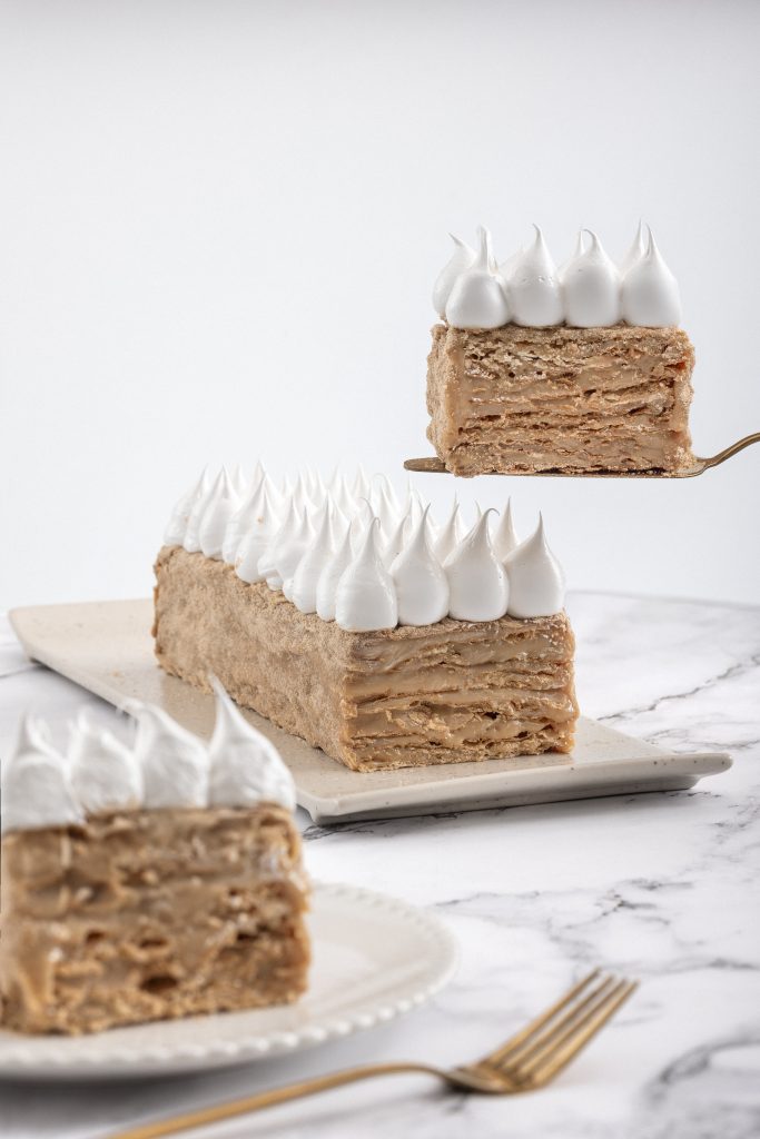 Capas crujientes de hojarasca con manjar artesanal y decorada con un delicioso merengue.
