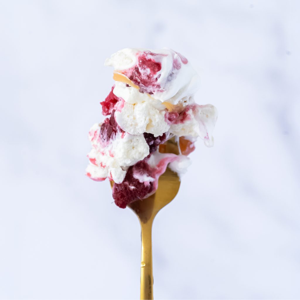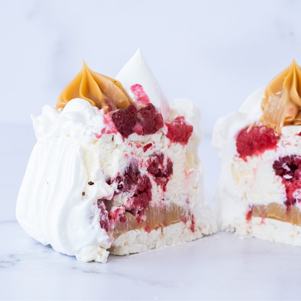 Capas de merengue crocante, crema y un delicioso manjar artesanal con frambuesas naturales. Una mezcla suave y con el equilibrio perfecto.