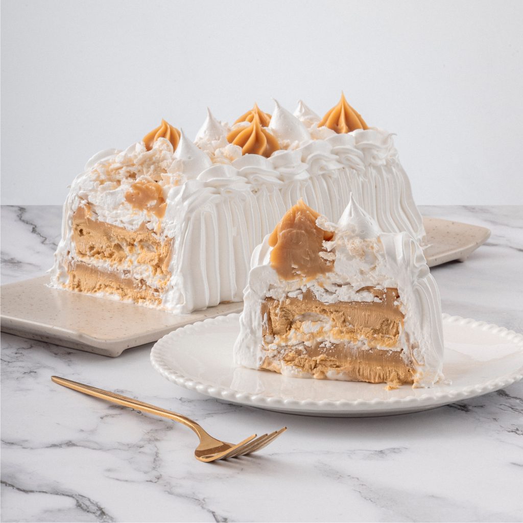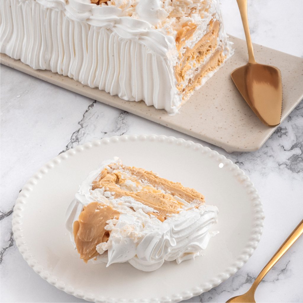 Capas de merengue crocante, manjar artesanal y una crema de lúcuma muy suave.