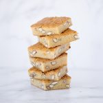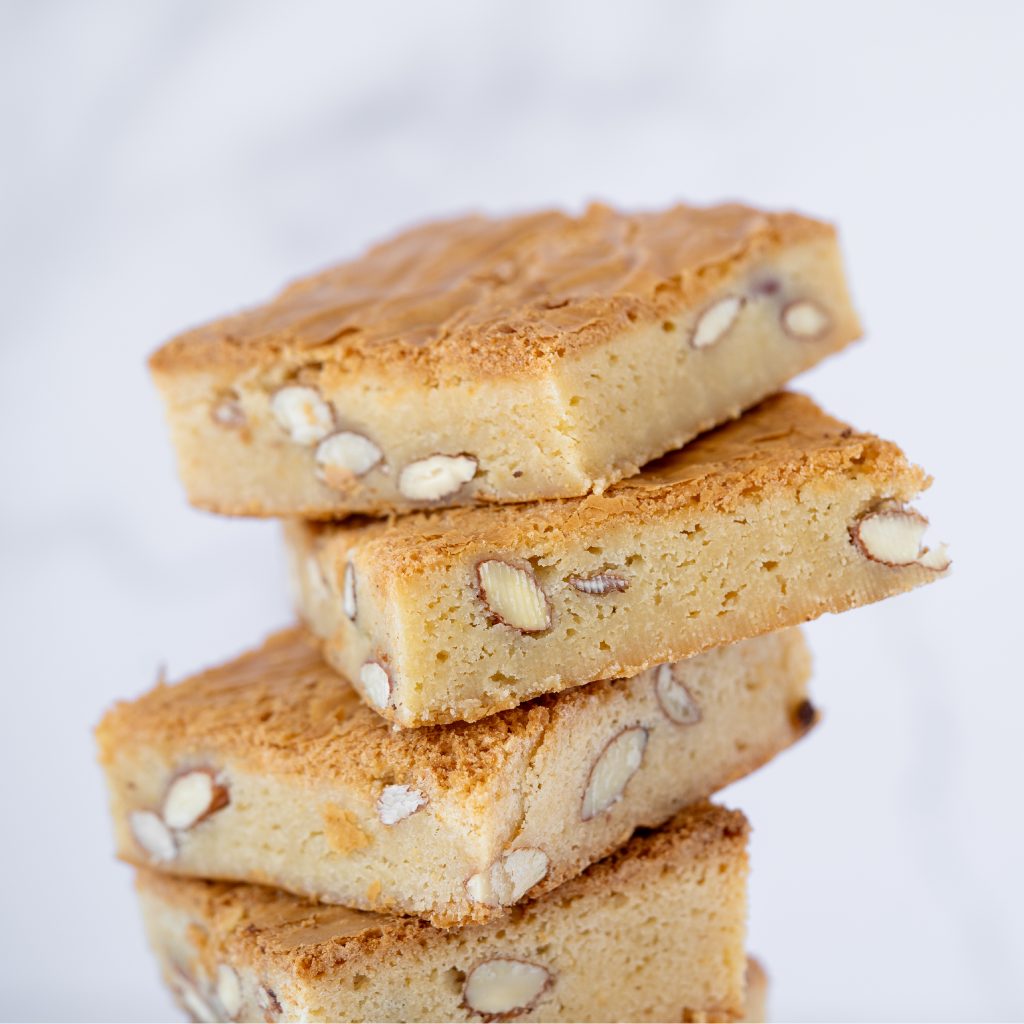 Fudge blondie de chocolate blanco con trozos de almendra.