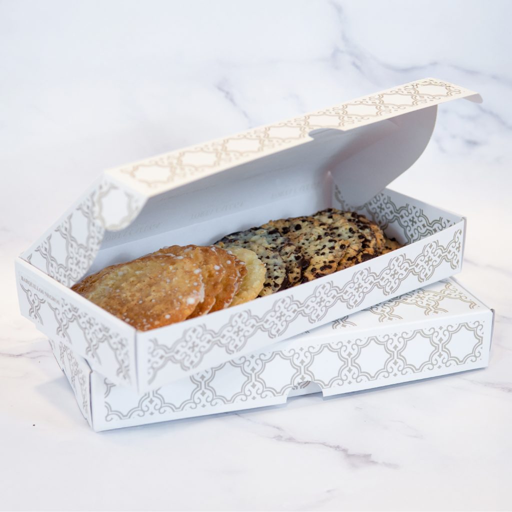 Mix de galletas crocantes de caramelo y láminas de almendra, bañadas con una fina capa de chocolate semiamargo y chocolate blanco.